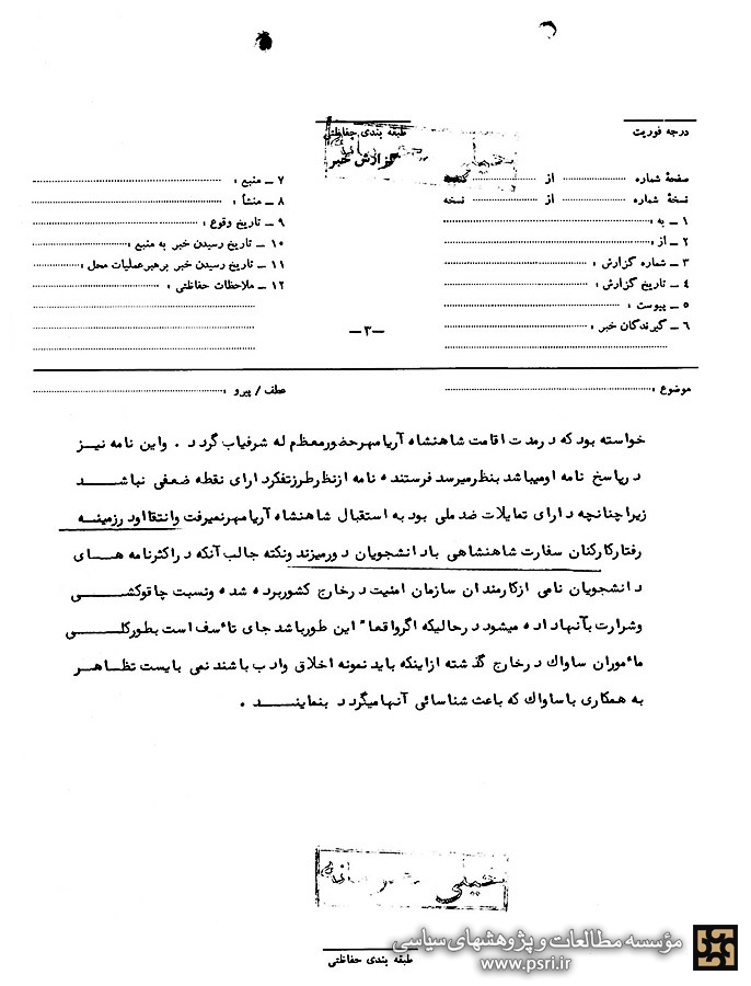 ۲- این سند خود گواهی بر شکل رفتار مأموران و عوامل ساواک با مردم ایران است. رفتاری آنقدر زشت و خلاف عرف که اکثر دانشجویان ایرانی مقیم خارج از کشور به آنان نسبت «چاقوکشی و شرارت» دادهاند.