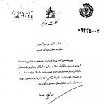موضوع : پخش اعلامیه شماره : 41/10814/15 ب 2 تاریخ 3/9/41 گیرنده : مدیریت کل اداره سوم فرستنده : ساواک خوزستان بدین وسیله یک فقره رونوشت تلگرافات آقاى محمدرضا الموسوى گلپایگانى که در ایستگاه بالارود به وسیله دو نفر از طلاب حوزه علمیه قم پخش گردیده بوده به پیوست تقدیم مىگردد. رئیس ساواک استان خوزستان ـ م. خاورى رونوشت نامه پیروى ضمیمه گشت به پرونده آقاى محمدرضا الموسوى گلپایگانى ضمیمه شود ـ کیانى 11/9/41 فعلاً...