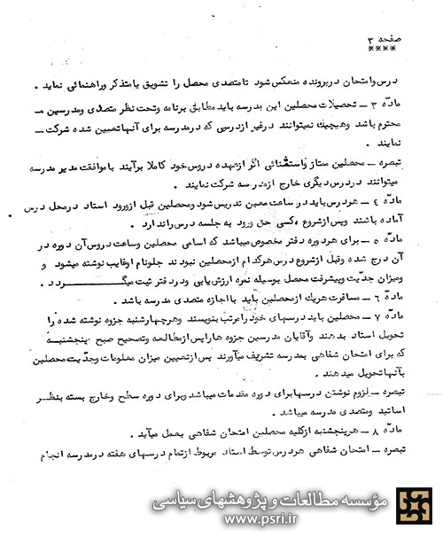 ماده 3ـ تحصیلات محصلین این مدرسه باید مطابق برنامه و تحتنظر متصدى و مدرسین محترم باشد و هیچیک نمیتوانند در غیر از درسى که در مدرسه براى آنها تعیین شده شرکت نمایند.