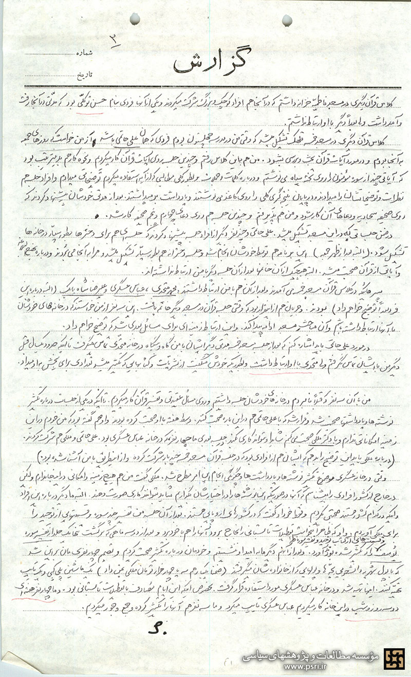 این نکته را فراموش کردم که مدتی بعد از برگشت از مسافرت، فردی بنام سعید که در جلسه قرآن قلهک رفت و آمد میکرد و بعد از آن جلسه دیگر مدتی او را ندیدم، توسط متحدی با من تماس گرفت و گفت که در رضائیه درس میخواند و در آنجا یک روحانی بنام حسنی هست که سلاح در اختیار دارد و ممکن است اگر با او تماس بگیریم بتوانیم از امکاناتش استفاده کنیم. من هم پذیرفتم و همراه او به رضائیه رفتم و در اتاقی که خودش داشت ماندم و روز بعد برای صحبت با حسنی رفتیم. در اتاق من و سعید و حسنی و فرد دیگری بودیم. صحبتهای مختلفی درباره اوضاع سیاسی روز شد و سعید مسئله چگونگی در اختیار گذاشتن سلاح را مطرح کرد. او گفت که سلاح خیلی گران بدست میآید و پول برای تهیه آن در اختیار نداریم. در اثنای این صحبتها چون وضع شهر در آن روز متشنج بود حسنی گفت که کار فوری دارد و بنا شد که بعداً باز هم صحبت شود ولی دیگر مجالی بعداً پیش نیامد و آن برخورد هم بینتیجه بود.