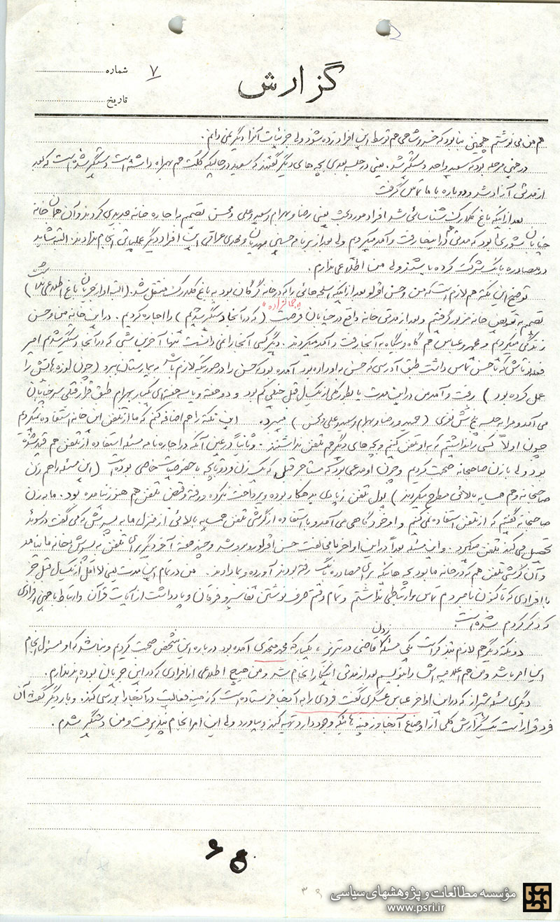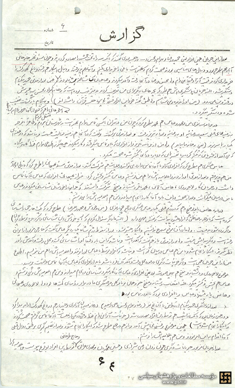 عباس عسگری هم مطرح کرد که افرادی که او با آنها تماس دارد میتوانند در عملیات هم شرکت کنند. بعد از مدتی مسئله بهبهانی[3] را طرح کرد که دنبال او بروند من هم پذیرفتم و بعد از مدتی او را زدند و اعلامیهاش را هم من نوشتم و عباس تکثیر و پخش کرد. غیر از بهبهانی افرادی که عباس با آنها تماس داشت در جریان کار لاجوردی[4]، هانس آلمانی[5]، محمدباقر دشتیانه[6] و مفتح شرکت داشتند که همه اینها را خودشان شناسائی میکردند و عباس با من در میان میگذاشت و بعد از صحبت در این باره آنها کار را انجام میدادند و من هم اعلامیهاش را مینوشتم.