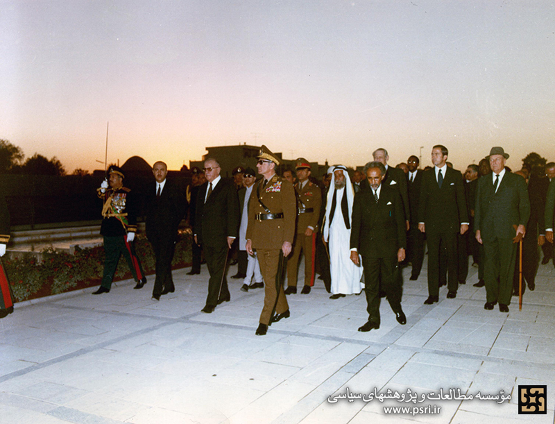 حضور محمدرضا پهلوی به همراه عدهای از مهمانان خارجی جشنهای 2500 ساله در مقبره رضاشاه