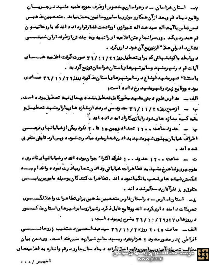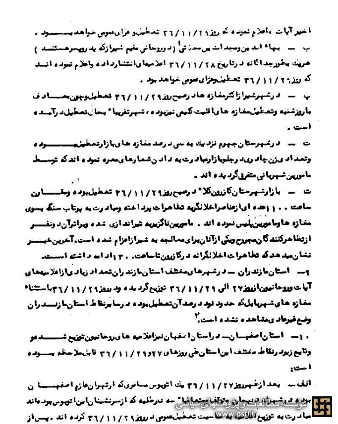 ۹ ـ استان مازندران ـ در شهرهای مختلف استان مازندران تعداد زیادی از اعلامیههای آیات و روحانیون از روز ۲۷ الی ۲۹ /۱۱ /۳۶ توزیع گردیده و در روز ۲۹ /۱۱ /۳۶ به استثنای مغازههای شهر بابل که حدود نود درصد آن تعطیل بوده در سایر نقاط استان مازندران وضع غیرعادی مشاهده نشده است.