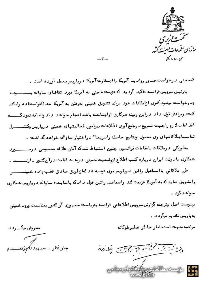 به پیوست اصل و ترجمه گزارش سرویس اطلاعاتی فرانسه به ریاست جمهوری آن کشور به مناسبت ورود خمینی به پاریس تقدیم میگردد.