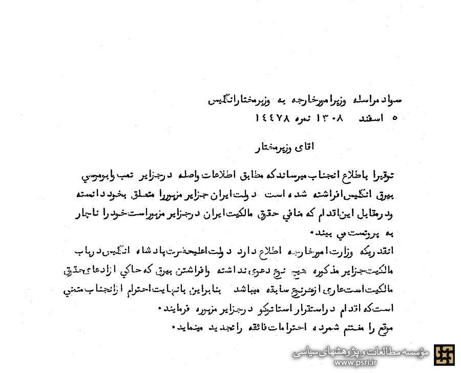 توقیراً به اطلاع آنجناب میرساند که مطابق اطلاعات واصله، در جزایر تمب و ابوموسی بیرق انگلیس افراشته شده است. دولت ایران جزایر مزبور را متعلق به خود دانسته و در مقابل این اقدام که منافی حقوق مالکیت ایران در جزایر مزبور است، خود را ناچار به پروتست میبیند. آنقدری که وزارت امور خارجه اطلاع دارد، دولت اعلیحضرت پادشاه انگلیس در باب مالکیت جزایر مذکوره هیچ نوع دعوی نداشته و افراشتن بیرق که حاکی از ادعای حقوق مالکیت است، عاری از هر نوع سابقه میباشد. بنابراین با نهایت احترام از آنجناب متمنی است که اقدام در استقرار استاتوکو(۲) در جزایر مزبوره فرمایند. موقع را مغتنم شمرده احترامات فائقه را تجدید مینماید.