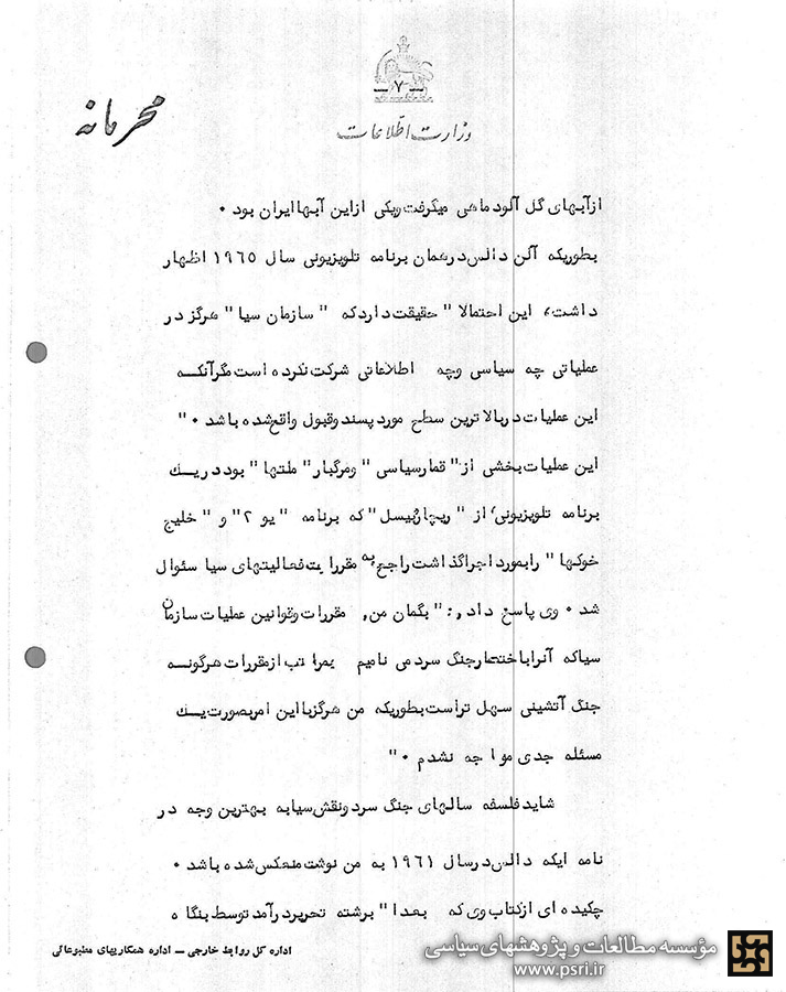 متن زیر مربوط به مقالهای با عنوان «هلمز، شاه و سازمان سیا» به قلم «چالمرز رابرتز» میباشد که در روزنامه «واشنگتنپست» مورخه ۲۹ دسامبر ۱۹۷۲ (۸ دیماه ۱۳۵۱) به چاپ رسیده است و وزارت اطلاعات با قید محرمانه آن را ترجمه و گردش کار کرده است. تا پیش از سال ۱۳۵۳، در دولت رژیم پهلوی ساختاری به نام وزارت اطلاعات وجود داشت که وظیفه تولید و انتشار اخبار و اطلاعات مربوط به رژیم را بر عهده داشت.
