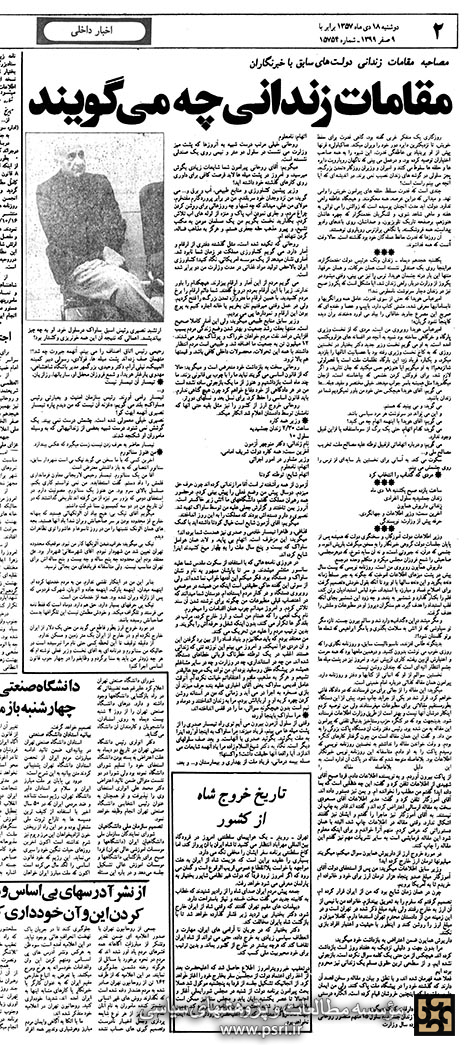 در ادامه، متن مصاحبه خبرنگار روزنامه اطلاعات در دیماه ۱۳۵۷ با تنی چند از این مقامات زندانی را عیناً آوردهایم که خواندن آن خالی از لطف نیست: