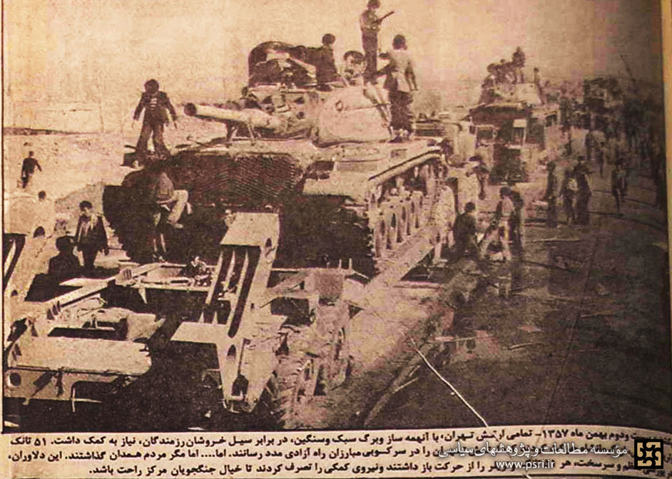 در آستانه قطعی شدن پیروزی مردم، تانکهای ارتش به میدان آورده شد تا جلوی پیروزی را بگیرد. به عنوان نمونه روزنامه کیهان ۲۴ بهمنماه ۱۳۵۷ نوشت: «یکشنبه بیست و دوم بهمنماه ۱۳۵۷ - تمامی ارتش تهران، با آن همه ساز و برگ سبک و سنگین، در برابر سیل خروشان رزمندگان، نیاز به کمک داشت. ۵۱ تانک و تریلر ارتشی از کرمانشاه حرکت کردند که ارتش تهران را در سرکوبی مبارزان راه آزادی مدد رسانند. اما... اما مگر مردم همدان گذاشتند. این دلاوران، در یورشی منظم و سرسخت، هر ۵۱ تانک و تریلر را از حرکت بازداشتند و نیروی کمکی را تصرف کردند تا خیال جنگجویان[=انقلابیون] مرکز راحت باشد.» (مشروح ماجرا را اینجا بخوانید.)
