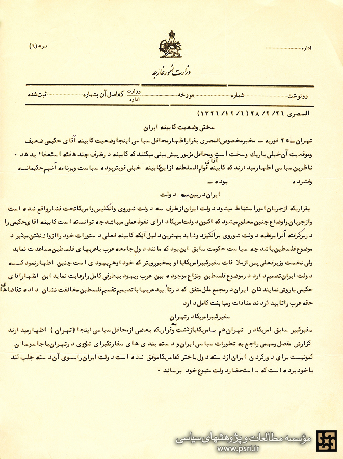 «... به قراری که از جریان امور استنباط میشود دولت ایران از طرف سه دولت شوروی و انگلیس و آمریکا تحت فشار واقع شده است، و از جریان و اوضاع چنین معلوم میشود که اکنون دولت آمریکا دارای نفوذ عملی میباشد. چه توانسته است کابینه آقای حکیمی را دربرگرفته، آن را بر علیه دولت شوروی برانگیزد و شاید بهترین دلیل اینکه کابینه فعلی دستورات خود را از واشنگتن میگیرد، موضوع فلسطین باشد. چه سیاست حکومت سابق[=دولت قوامالسلطنه] این بود که مانند دُول جامعه عرب با عربهای فلسطین مساعدت نماید(۱)، ولی نخستوزیر فعلی پس از ملاقات سفیرکبیر آمریکا با او به مخبر رویتر، که خود او هم یهودی است، چنین اظهار نمود که دولت ایران تصمیم دارد در موضوع فلسطین و نزاع موجوده بین عرب و یهود، بیطرفی کامل[!] را رعایت نماید...».