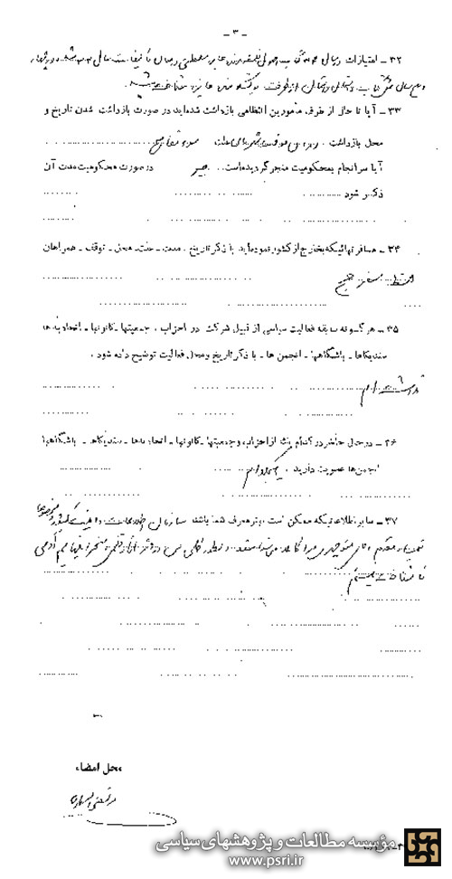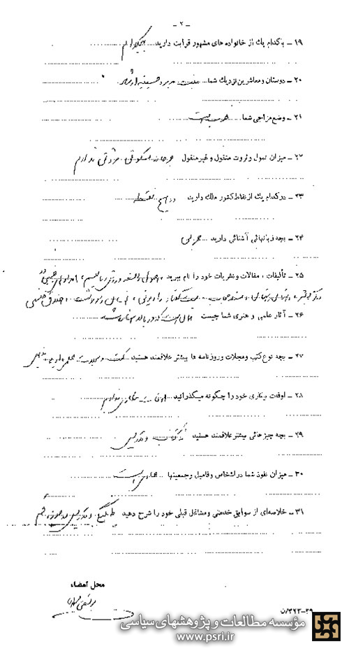 37ـ سایر اطلاعاتى که ممکن است بهتر معرف شما باشد: سازمان اطلاعات و امنیت کشور و مخصوصا تیمسار مقدم آقاى منوچهرى مرا کاملا مىشناسند و بطور کلى من در اثر آثار قلمى و سخنرانیهایم آدمى ناشناخته نیستم. محل امضاء: مرتضى مطهرى