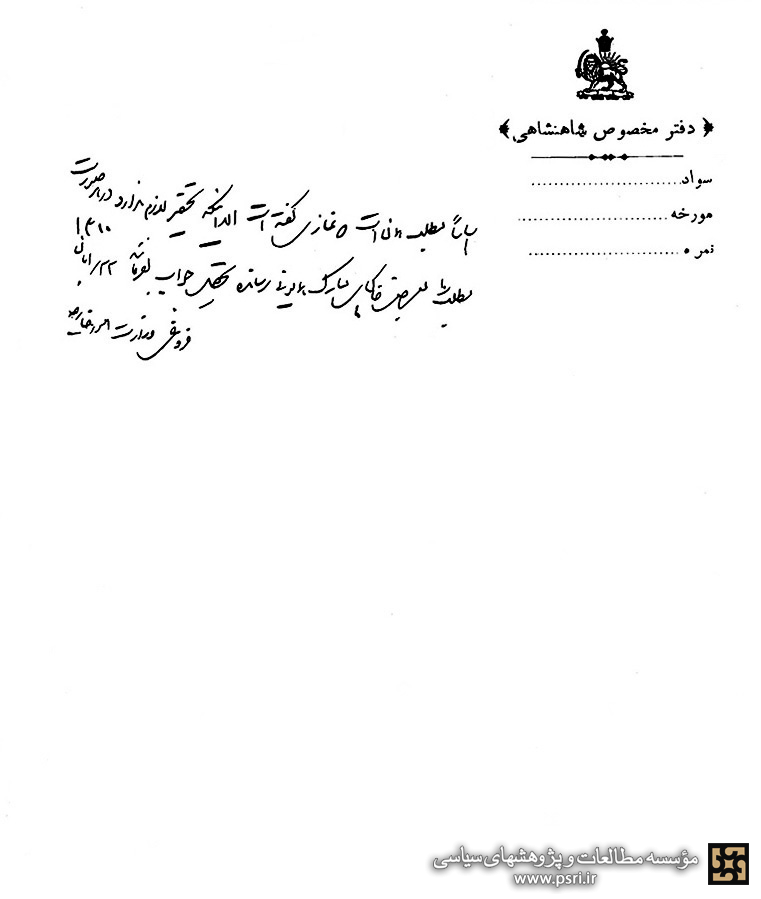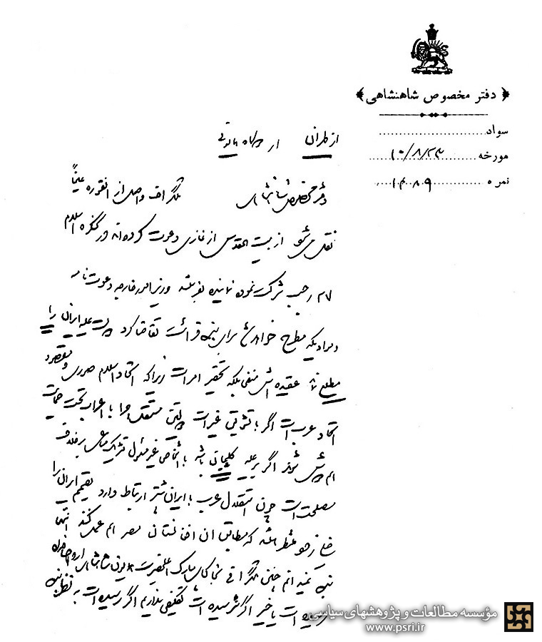 تلگراف واصل از انقوره[=آنکارا] عیناً نقل میشود: از بیتالمقدس از غازی [ترکیه] دعوت کردهاند در کنگره اسلام [در تاریخ] ۲۷ رجب شرکت نموده، نماینده بفرستند. وزیر امورخارجه [ترکیه] دعوتنامه و موادی که مطرح خواهد شد، برای بنده قرائت [و] تقاضا کرد دولت علیه ایران را مطلع نماید. عقیدهاش منفی، بلکه تحقیر امر است، زیرا که اتحاد اسلام صوری، و مقصود اتحاد عرب است. اگر با تشویق غیر است دولتین مستقل چرا با اعرابِ تحت حمایت همدوش شوند. اگر بر علیه کلیمیان باشد، با اشخاص غیرمسئول تشریک مساعی برخلاف مصلحت است، چون استقلال عرب با ایران بیشتر ارتباط دارد. تصمیم ایران را خیلی زود منتظر هستند که مطابق آن افغانستان [و] مصر هم عمل کنند. [در] انتها بنده نمیدانم چنین تلگرافی به خاکپای مبارک اعلیحضرت همایون شاهنشاهی ارواحنا فداه رسیده است یا خیر، اگر نرسیده است تکلیفی نداریم، اگر رسیده است به نظر بنده اساساً مطلب همان است که غازی گفته است، الّا اینکه تحقیر لازم ندارد. در هر صورت مطلب را به عرض خاکپای مبارک همایونی رسانده، تحصیل جواب بفرمایید. ۲۲ آبان ۱۳۱۰