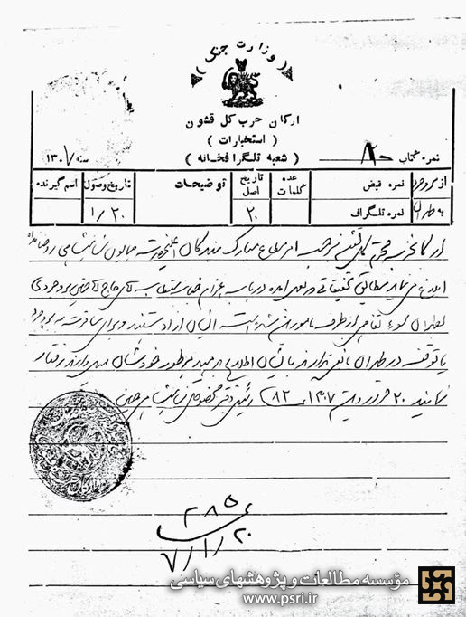 ریاست محترم ارکان حرب کل قشون، طبق راپرت رئیس ارکان حرب لشکر که مستند به مراسله جنرال قونسولگری ایران مقیم بغداد میباشد شیخاحمد شاهرودی و حاجیآقاحسین بروجردی از طرف آقامیرزاحسین نایینی و آقاسیدابوالحسن اصفهانی حامل بعضی نوشتهجات بر ضد سیاست دولت برای اغلب علمای ایرانی میباشند و از طریق قصر[شیرین] قصد مسافرت ایران دارند و گرچه از طرف جنرال قونسولگری مزبور در جلوگیری از مسافرت آنها اقدام شده ولی به رئیس ارکان حرب نیز فوراً دستور داده شده به وسیله مفتشین مخفی و مأمورین زیرک ورود آنها را قبلاً به شهر کرمانشاهان اطلاع حاصل نموده قبل از اینکه وارد شهر شوند به وسیله مأمورین اسناد و نوشتهجات آنها را مأخوذ [نموده] خودشان را هم محرمانه به طهران اعزام دارند. متمنی است چنانچه در این موضوع ارکان حرب محترم کل نظریاتی دارند قدغن فرمائید مستقیماً به رئیس ارکان حرب لشکر ابلاغ نمایند.