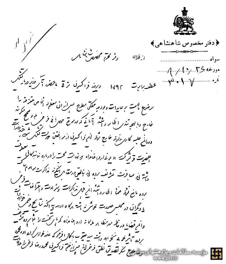 نمره ۱۷۵۸ از شرفعرض خاکپای مبارک ملوکانه ارواحنا فداه گذشت. مقرر فرمودند ابلاغ نمایم جواب فرخی را باید خود وکلا در مجلسِ علنی به سختی بدهند و او را ساکت کنند، و از اینکه تاکنون هیچ اظهاری در مجلس به مشارالیه نشده، معلوم میشود سایرین هم با او همراه هستند. به هرحال مشارالیه در موقع خود تعقیب خواهد شد.