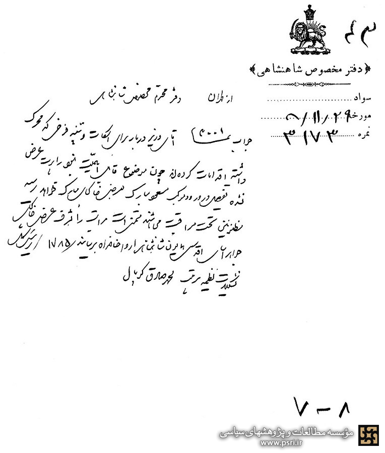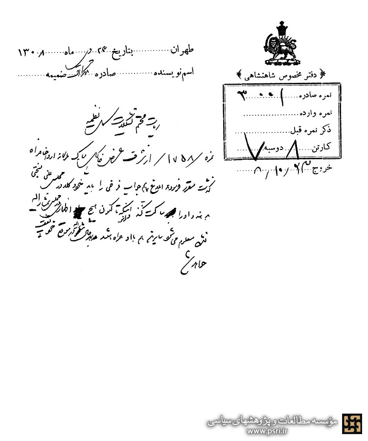 جواب نمره ۳۰۰۱، آقای وزیر دربار برای اسکات و تنبیه فرخی که محرک داشته، اقدامات کردهاند. چون موضوع قابل اهمیت نبوده راپرت عرض نشده. تفصیل در ورود موکب مسعود مبارک به عرض خاکپای مبارک خواهد رسید. مظنونین تحت مراقبت میباشند. متمنی است مراتب را به شرفعرض خاکپای جواهرآسای اقدس همایون شاهنشاهی ارواحنا فداه برسانید. نمره ۱۷۸۵