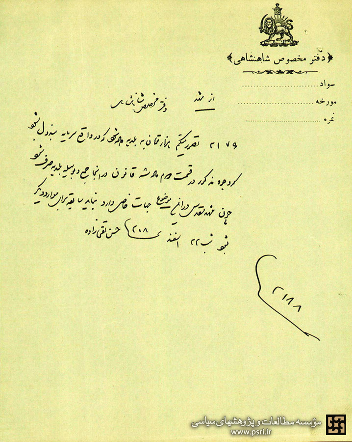 تصور میکنم هزار تومان به بلدیه داده شود که در واقع سرمایه مبذول بشود که وجوه مذکور در قسمت دوم ماده ۳ قانون در آنجا جمع و به وسیله بلدیه صرف شود. چون مشهد مقدس در این موضوع جهات خاصی دارد، نباید سابقه برای موارد دیگر بشود. شب ۲۲ اسفند - نمره ۲۰۸ - حسن تقیزاده
