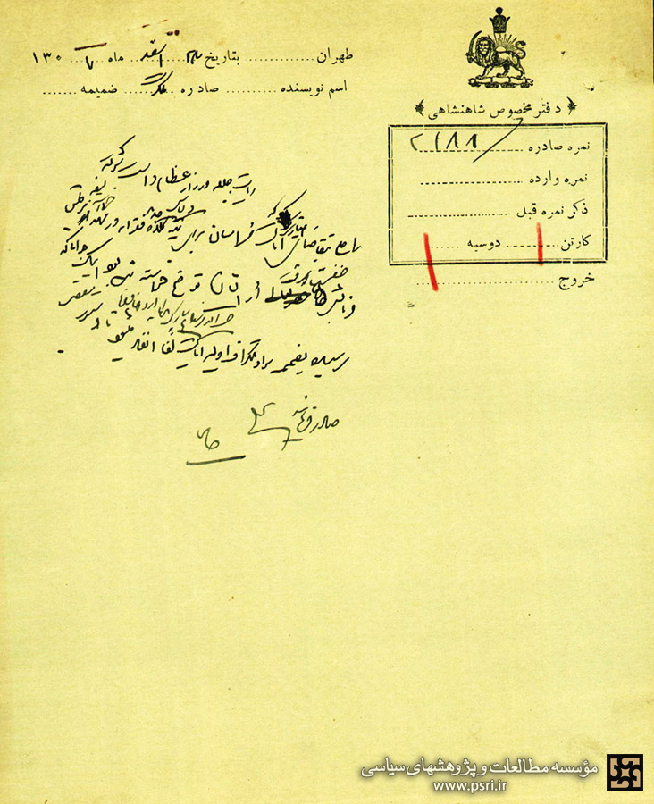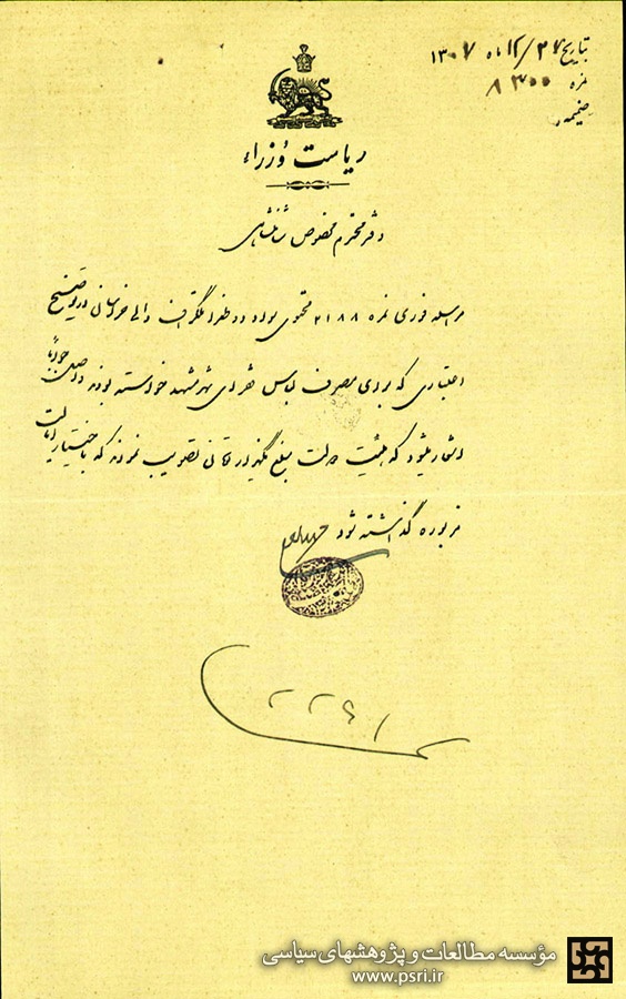 مراسله فوری نمره ۲۱۸۸ محتوی سواد دو طغرا تلگراف والی خراسان در توضیح اعتباری که برای مصرف لباس فقرای شهر مشهد خواسته بودند واصل [شد]. جواباً اشعار میشود که هیئت دولت مبلغ یک هزار تومان تصویب نمودند که به اختیار ایالت مزبوره گذاشته شود. [امضاء] مهدیقلی هدایت ریاست وزراء