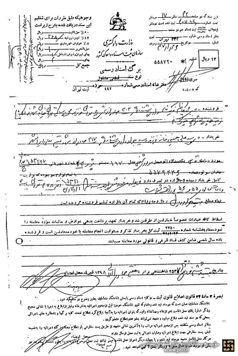 در سال 1356 خریدار طبق سند شماره 40786063453 حضرت حجتالاسلاموالمسلمین جناب آقای حاج سیدعلی خامنهای (دامت برکاته) و فروشنده آقای نیکنام معرفی گردید. [...] مورد معامله یک دستگاه ماشین پژو 404 به شماره 53287 تهران ج به مبلغ300.000 ریال و فروشنده در دفترخانه امضا نمود و سند دریافت گردید.