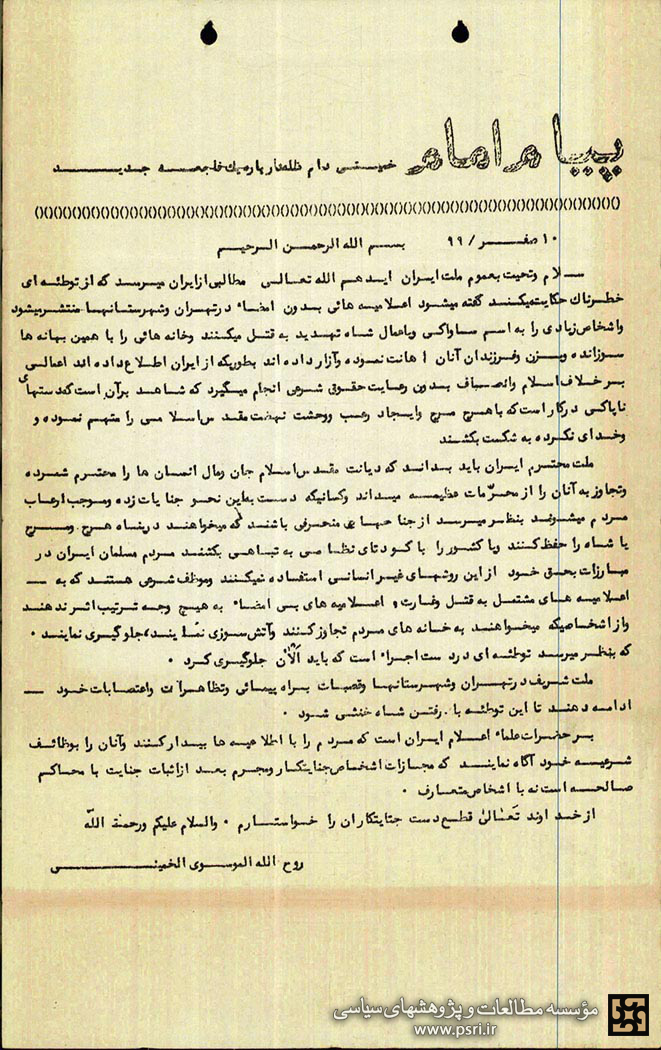 ملت محترم ایران باید بداند که دیانت مقدس اسلام، جان و مال انسانها را محترم شمرده و تجاوز به آن را از محرّمات عظیمه میداند، و کسانی که دست به این نحو جنایات زده و موجب ارعاب مردم میشوند، به نظر میرسد از جناحهای منحرفی باشند که میخواهند در پناه هرج و مرج، یا شاه را حفظ کنند و یا کشور را با ایجاد کودتای نظامی به تباهی بکشند.