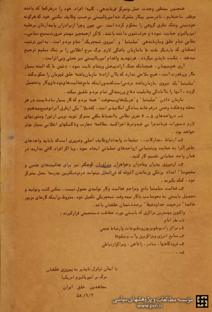 این اطلاعیه با اشاره به «جنگ آزادیبخش ویتنام»، علاج را «میلیشیا یک نیروی سازمانیافتهٔ مردمی» دانست اما در حقیقت به دنبال نظریه اصلی خود بود که انقلاب اسلامی را نارس میدانست و معتقد به ضرورت انقلابی دیگر منطبق با نظریات چریکی بود.