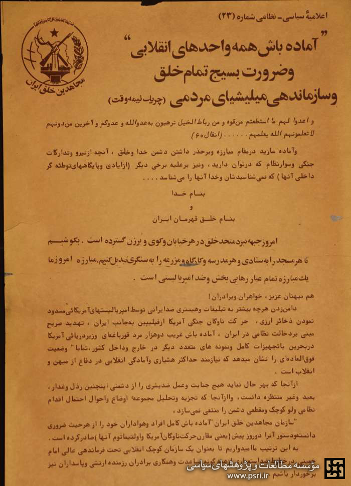 سازمان مجاهدین خلق در اطلاعیهٔ سیاسی-نظامی شمارهٔ ۲۳ مورخ ۲ آذر ۱۳۵۸ با عنوان «آمادهباش همهٔ واحدهای انقلابی و ضرورت بسیج تمام خلق و سازماندهی میلیشیای مردمی» اعلام کرد: «دامن زدن هر چه بیشتر به تبلیغات و هیستری ضدایرانی توسط امپریالیستهای امریکایی، مسدود نمودن ذخایر ارزی، حرکت ناوگان جنگی آمریکا از فیلیپین به جانب ایران، تهدید صریح مبنی بر دخالت نظامی در ایران، آمادهباش قریب دو هزار مرد قورباغهای و زیردریایی امریکا در بحرین با تجهیزات کامل و نمونههای متعدد دیگر در خارج و داخل کشور تماماً وضعیت فوقالعادهای را نشان میدهد که نیازمند حداکثر هشیاری و آمادگی انقلابی در دفاع از میهن و انقلاب است. [...] سازمان مجاهدین خلق ایران آمادهباش کامل افراد و هواداران خود را از هر حیث ضروری دانسته و دستور آن را دو روز پیش (یعنی مقارن حرکت ناوگان آمریکا و اولتیماتوم آنها) صادر کرده است.»
