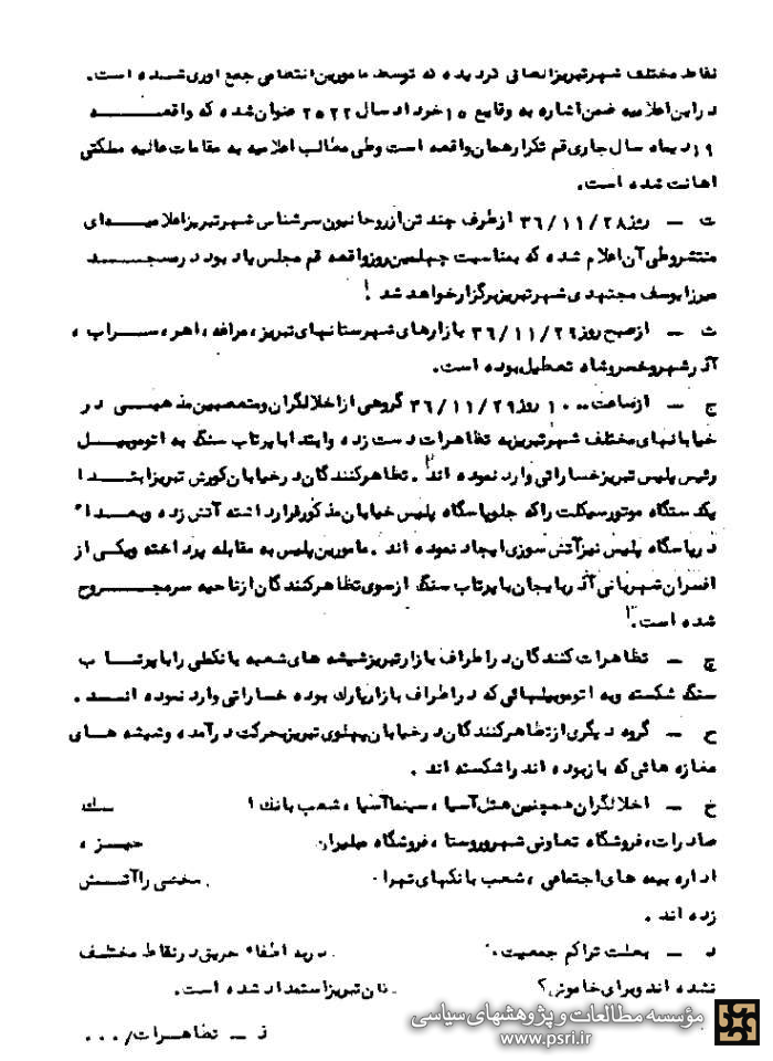 ث ـ بازار شهرستان کازرون کلاً در صبح روز ۲۹ /۱۱ /۳۶ تعطیل بوده و مقارن ساعت ۱۱:۰۰ عدهای از عناصر اخلالگر به تظاهرات پرداخته و مبادرت به پرتاب سنگ به سوی مغازهها و مامورین پلیس نمودهاند.