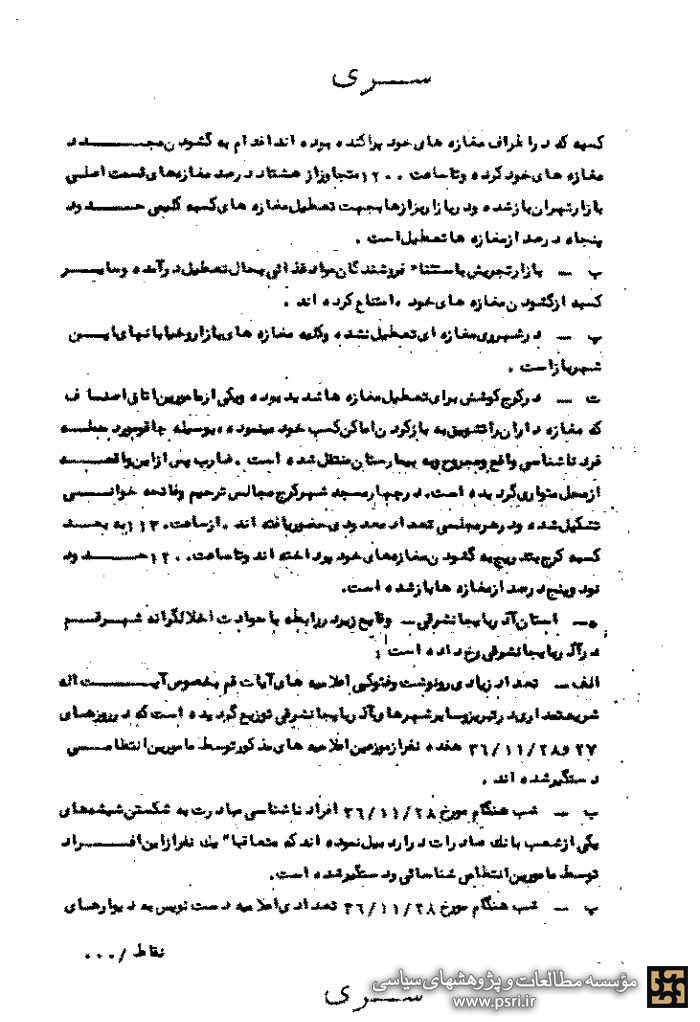 ب ـ از صبح روز ۲۹ /۱۱ /۳۶ حدود سی درصد از مغازههای بازار مشهد تعطیل و بقیه کسبه مغازههای خود را باز و به کار ادامه دادهاند.