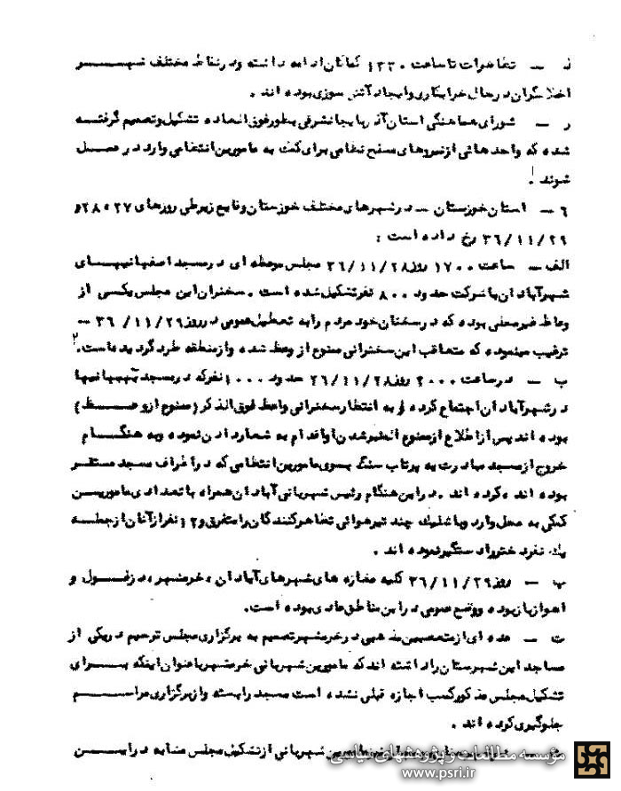 ۱ ۶ ـ استان خوزستان ـ در شهرهای مختلف خوزستان وقایع زیر طی روزهای ۲۷، ۲۸ و ۲۹ /۱۱ /۳۶ رخ داده است: الف ـ ساعت ۱۷:۰۰ روز ۲۸ /۱۱ /۳۶ مجلس موعظهای در مسجد اصفهانیهای شهر آبادان با شرکت حدود ۸۰۰ نفر تشکیل شده است.
