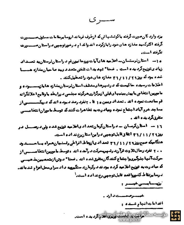 ۱ ث ـ از صبح روز ۲۹ /۱۱ /۳۶ بازارهای شهرستانهای تبریز، مراغه، اهر، سراب، آذرشهر و خسروشاه تعطیل بوده است.