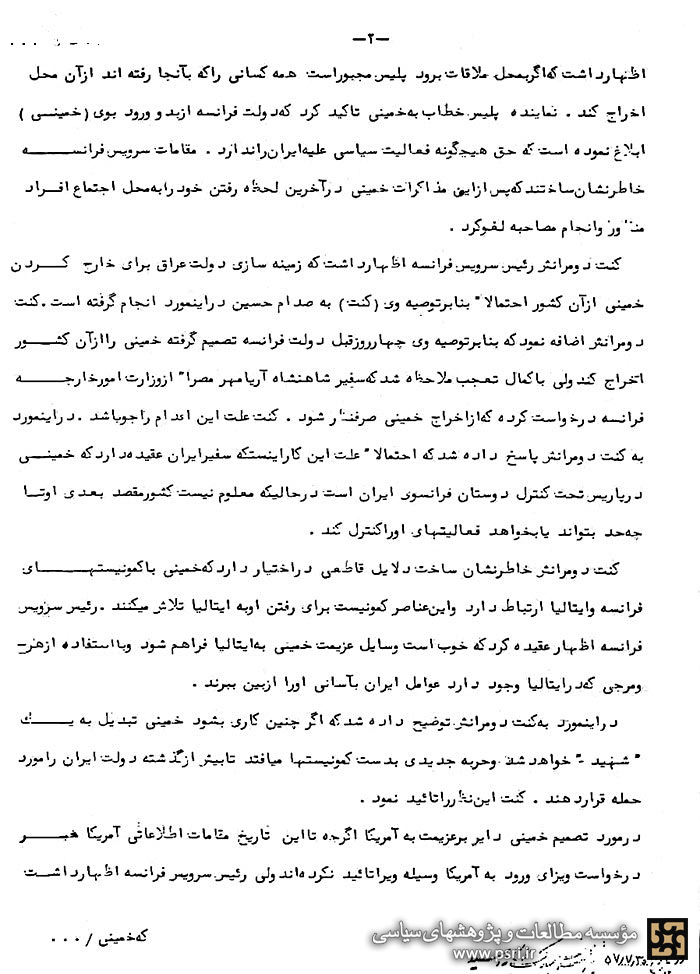 به پیوست اصل و ترجمه گزارش سرویس اطلاعاتی فرانسه به ریاست جمهوری آن کشور به مناسبت ورود خمینی به پاریس تقدیم میگردد.