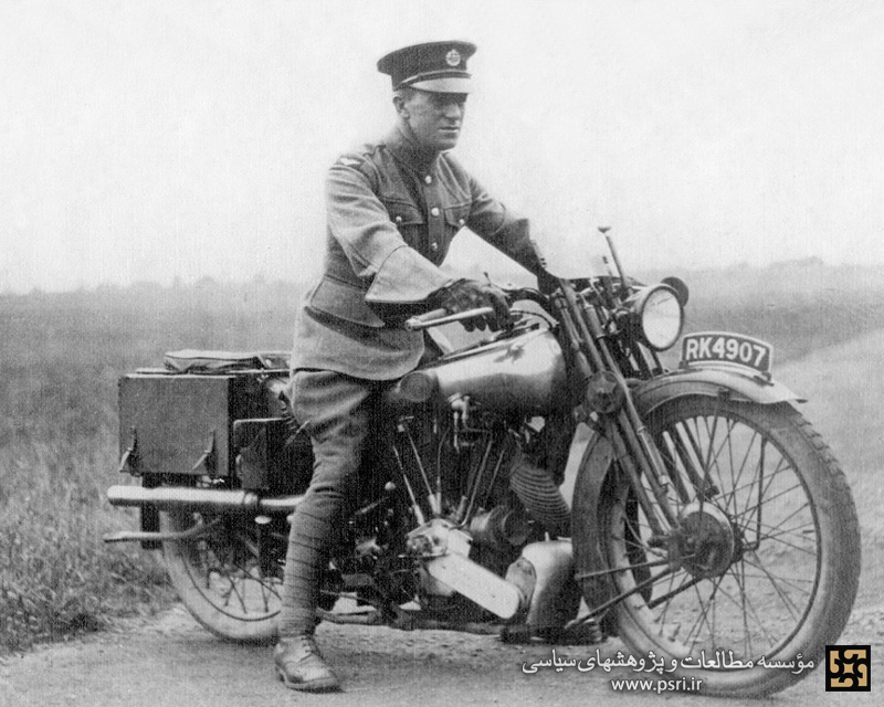لورنس سوار بر موتورسیکلتش در حدود سال ۱۳۰۴