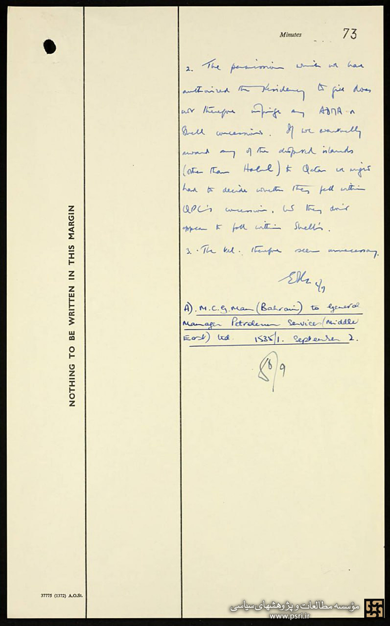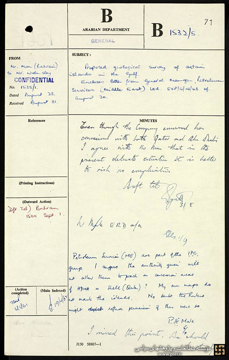 این مکاتبات مربوط به دوره زمانی تلاش برای تثبیت منافع هنگام ترک منطقه است و نمایندگی در آن مقطع در بحرین مستقر بوده است. بریتانیا نگران از دست دادن حوزههای نفتی هنگام اجرای سیاست خروج از خلیج فارس است و به صراحت در یکی از این اسناد آمده است «سرعت عامل مهمی است.» اما مهمترین نکته این اسناد، تردیدها درباره تعلق سرزمینی این جزایر است که نشان میدهد به تعبیر قید شده در مکاتبات اداری انگلستان، هنوز «اعلی حضرت» درباره این جزایر تصمیم نگرفته است.