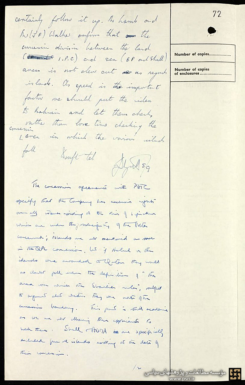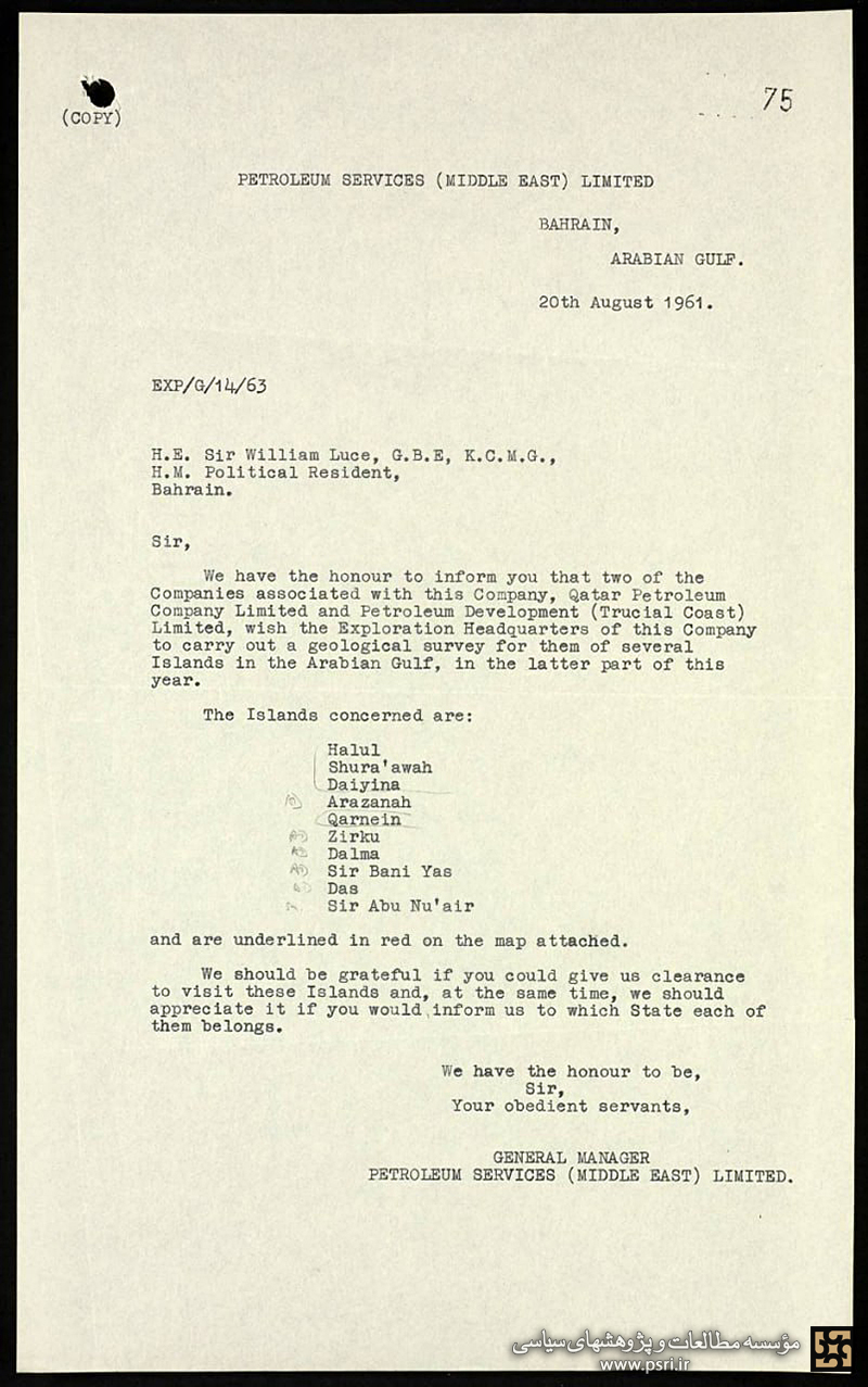 اسناد حاضر، از اشغال جزایری از خلیج فارس همچون آریانا (صیر بو نعیر)، ارزنه و زرکوه توسط شرکتهای نفتی در تابستان ۱۳۴۰ خبر میدهد و از نگرانی آنها درباره چگونگی استخراج نفت از «هر یک از جزایر مورد مناقشه» حکایت میکند و وزارت خارجه بریتانیا در حال تنظیم پیشنهاد برای چگونگی اعلام مالکیت آن است.