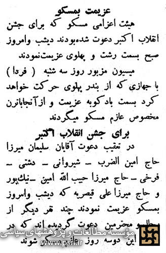 «هیأت اعزامی مسکو که برای جشن انقلاب اکتبر دعوت شده بودند، دیشب و امروز صبح به سمت رشت و[بندر]پهلوی عزیمت نمودند. میسیون مزبور روز سهشنبه(فردا) با جهازی که از بندر پهلوی حرکت خواهد کرد به سمت بادکوبه عزیمت و از آنجا با ترن مخصوص عازم مسکو میگردند. در تعقیب دعوت آقایان سلیمانمیرزا، حاج امینالضرب، شیروانی، دشتی، فرخی، حاج میرزاحبیبالله امین، نیکپور و حاج میرزاعلی قیصریه که دیشب و امروز به مسکو عزیمت نمودند، چند نفر دیگر از رجال و محترمین دعوت گردیدهاند که در ظرف این دو سه روز عازم مسکو شوند».
