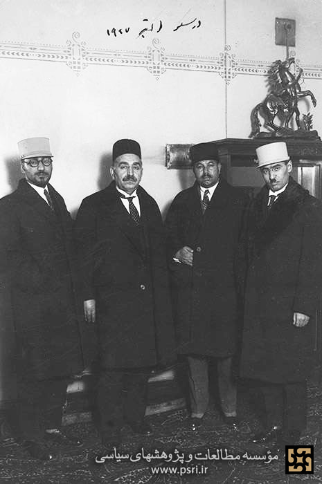 [دستخط علی دشتی بر روی عکس]: بر حسب دعوت حکومت شوروی به مناسبت عید دهساله انقلاب در خدمت آقایان سلیمانمیرزا[اسکندری]، فرخی،[ابوطالب]شیروانی و خانم میزبان؛ مسکو؛ اکتبر ۱۹۲۷