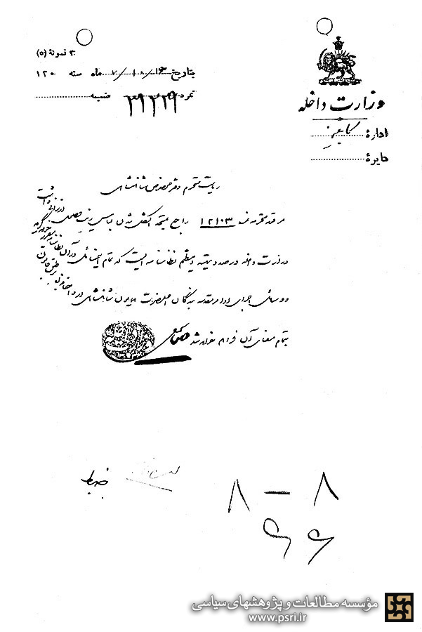 مرقومه محترمه نمره ۱۲۱۰۳ راجع به متحدالشکل شدن لباس زیب وصول ارزانی داشت. وزارت داخله درصدد تهیه و تنظیم نظامنامهایست که تمام این مسائل در آن نظامنامه مقرر خواهد گردید و وسائل اجرای اوامر مقدسه بندگان اعلیحضرت همایون شاهنشاهی ارواحنا فداه بر طبق قانون به تمام معنای آن فراهم خواهد شد. [امضاء] حسین سمیعی