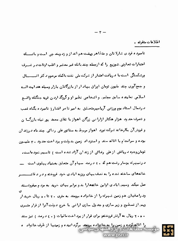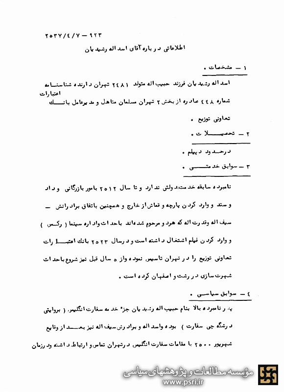 بیوگرافی آقای اسدالله رشیدیان مدیرعامل بانک اعتبارات، تلفن ۳۷۷۵۰۴ مورد نیاز تیمسار ریاست ساواک میباشد. استدعا میشود مقرر فرمایند تا آخر وقت اداری فردا چهارشنبه ۳۷/۴/۷ در مورد تهیه آن اقدام و به من تحویل دهند.