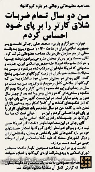 شهید رجایی:«من به مدت دو سال در زندانهای رژیم شاه معدوم زندانی کارتر و آمریکا بودم. آثار شکنجه و سختیهایی که در زندان بر من روا شد، بعد از چهارسال هنوز بر بدنم نمایان است. در این قسمت آقای رجایی پای خود را که آثار شکنجههای گذشته بر آن کاملاً آشکار بود، به خبرنگاران نشان داد، و گفت: من دو سال تمام ضربات شلاقهای کارتر را بر پای خود احساس کردم و این در حالی است که ما با گروگانها در جاسوسخانه[=لانه جاسوسی]، رفتاری کاملاً انسانی داریم...»(روزنامه جمهوری اسلامی؛ ۲۷ مهرماه ۱۳۵۹)