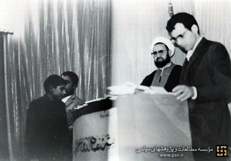 بادامچیان در کنار شهید مطهری در مجمع صادقیه اوایل دهه پنجاه