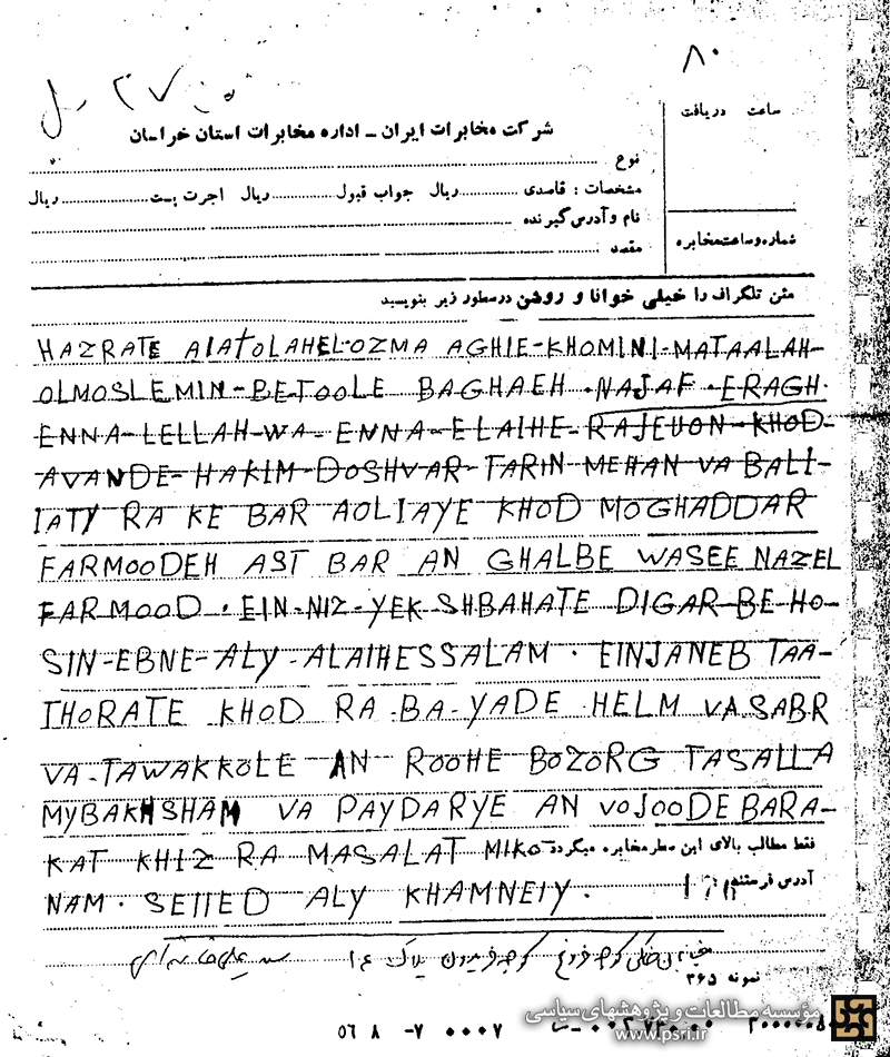 این تنها تلگرامی نبود که آقای خامنهای به نجف فرستاد. آن روز، سه متن دیگر را از طرف آقایان واعظ طبسی، هاشمینژاد و محامی خطاب به آیتالله خمینی مخابره کرد. «وقتی آنها را به متصدی پست دادم، بسیار تعجب کرد و به دوستانش نشان داد. آنان غرق شگفتی شدند. زیرا متن تلگرامهای تسلیت حاوی جملاتی بود که رژیم را به چالش میکشید و با امام خمینی ابراز همدردی عمیق در این مصیبت بزرگ میکرد و از او تمجید مینمود. کارمند پست گمان میکرد وقتی هزینه تلگرامها را به اطلاع من برساند، برای گرانبودن آنها عقبنشینی و از مخابره آنها صرفنظر خواهم کرد. اما وقتی اسکناسهای هزارتومانی را به او دادم، یکه خورد. پرداخت چنان هزینهای در آن روزها برای امثال من بسیار سنگین بود.»