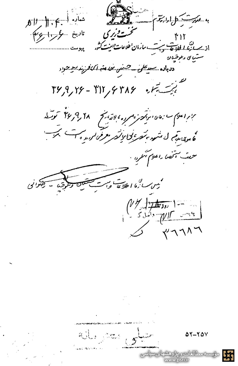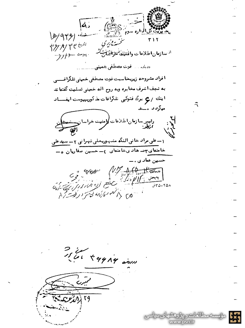 درگذشت غیرمنتظرهٔ سیدمصطفی خمینی در در سحرگاه یکشنبه اول آبان 1356، به مثابه جرقهای تازه در فضای سیاسی و مذهبی ایران قلمداد میشد. در مشهد، آیتالله خامنهای از نخستین کسانی بود که بههمراه جمعی از روحانیان مبارز، برای برگزاری مجالس ترحیم و بزرگداشت آقا مصطفی اقدام کرد؛ مجالسی که سوای از رنگ و بوی سوگوارانهای که داشت، در عمل به میدان ابراز همبستگی با امام خمینی و اعتراض به رژیم پهلوی تبدیل شد. تلگرامهای تسلیت آیتالله خامنهای به نجف، که لحنی صریح و سیاسی داشت، حساسیت ساواک را برانگیخت و نام او را دوباره در فهرست روحانیان تحت مراقبت قرار داد. بهانه یکم آبانماه؛ سالروز درگذشت آیتالله سید مصطفی خمینی، متن آن تلگراف تسلیت همراه با گزارش ساواک از آن، منتشر میشود.