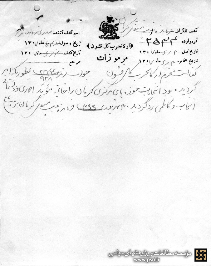 خواهشمندم قدغن فرمایید مینوت تلگراف ضمیمه را با امضاء بنده به فرمانده محترم تیپ مستقل کرمان امروز رمزاً صادر و مخابره نمایید.