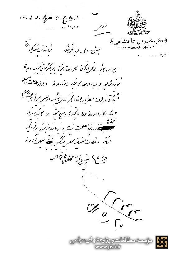 راجع به عدم انتخاب کاظمی از کرمان تلگرافاتی اخیراً به امیرلشکر سابق جنوب ابلاغاً مخابره شده بود. جواب داده بودند که به جنابعالی دستور دادهاند. از قرار اطلاعات واصله تشبثاتی از طرف بعضی از اعضای انجمن [نظارت بر انتخابات] برای انتخاب او به عمل میآید. بر حسب امر مطاع مبارک ملوکانه ارواحنا فداه تأکیداً ابلاغ میشود که انتخاب مشارالیه قطعاً در آنجا مصلحت نیست و باید به مأمورین قشونی قدغن اکید فرمایید اقدامات مقتضیه برای جلوگیری به عمل آورند. نمره ۹۲۸ - رئیس دفتر مخصوص شاهنشاهی