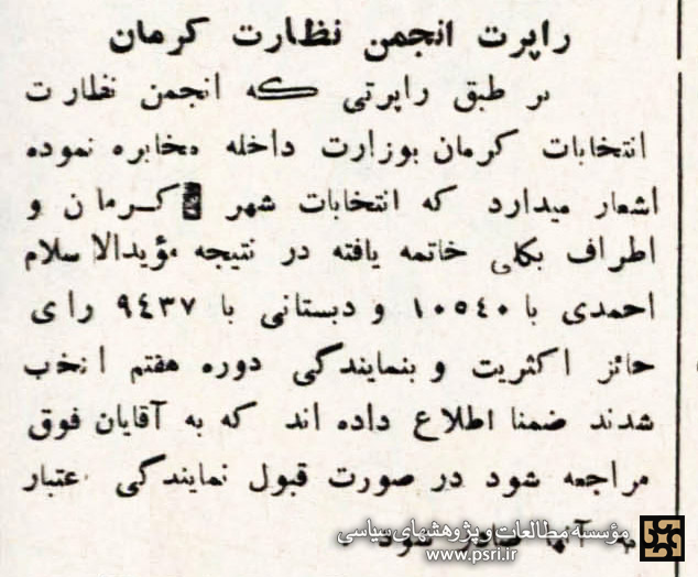 جواب رمز نمره ۲۲۴۴ - ۹۲۸ بهطوری که امر گردیده بود انتخابات حوزههای مرکزی کرمان را خاتمه [داده] [میرزا عبدالوهاب] مؤیداحمدی و [محمود] دبستانی انتخاب و کاظمی رد گردید. ۳ شهریور [۱۳۰۷] - نمره ۳۶۶ - فرمانده تیپ مستقل کرمان