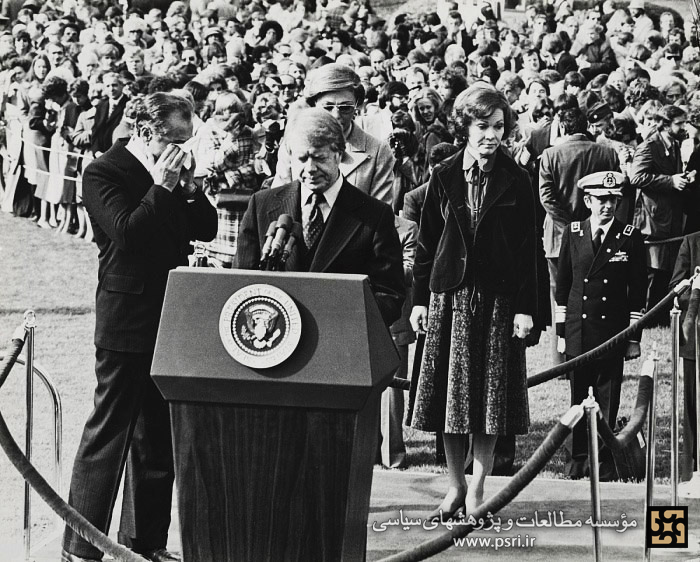 شاه و فرح در ۲۴ آبان ۱۳۵۶ از محل اقامت خود در ویلیامزبورگ عازم کاخ سفید در واشنگتن شدند تا در مراسم استقبال از سوی کارتر و همسرش شرکت کنند. اجرای این مراسم در حالی انجام میشد که فاصله میان جمعیت طرفداران و مخالفان شاه در بیرون از محوطه کاخ سفید و تعداد پلیسهایی که برای برقراری نظم حضور داشتند کم بود. در هنگام نواختن دسته موزیک، تظاهرکنندگان مخالف شاه شروع به تحرک نموده و پس از درگیری با پلیس به صف طرفداران شاه حمله بردند و پلیس آمریکا به ناچار برای متفرق نمودن آنان از گاز اشکآور استفاده نمود که سرایت گاز اشکآور به محوطه کاخ سفید موجب جاریشدن اشک از چشمان حاضران در مراسم از جمله شاه و کارتر گردید. جیمی کارتر این ماجرا را اینگونه روایت میکند:«لحظاتی فراموشنشدنی بود. صدای فریاد جمعیت علیه گروه پلیس اسبسوار که برای متفرق کردن آنها قوطیهای گاز اشکآور پرتاب کرده بودند از دور شنیده میشد. بدبختانه باد نابهنگام، گاز اشکآور را به طرف ما که در حال خوشامدگویی به رهبر ایران بودیم روانه ساخت. هنگامی که ورود شاه را به کشورمان خوشامد میگفتیم و دوربینهای تلویزیون به طرف من متمرکز شده بودند سعی داشتم اوضاع را عادی وانمود کنم و باوجود ناراحتی از مالش چشمانم خودداری نمایم و سوزش شدیدی که بسیاری از حاضران را نیز آزار میداد نادیده بگیرم. شاه و همسرش فرح که سخت ناراحت شده بودند چند بار از من و روزالین به خاطر مزاحمت ناشی از تظاهرات اعتراضآمیز دانشجویان عذرخواهی کردند.»
