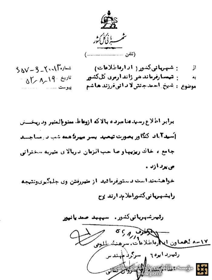 محترماً مقام عالی را آگاه میسازد به قرار اطلاع واصله واعظ یادشده بالا که برابر ردیف ۳۸ امریه شماره ۶-۶۵۲۵- ۱۸ /۶ /۵۲ ممنوعالمنبر گردیده و هماکنون در بخش اسدآباد به صورت تبعید به سر میبرد همه شب در مساجد (جامع ـ خاکریزیها ـ و صاحبالزمان) از منبر استفاده و سخنرانی مینماید. مراتب جهت آگاهی گزارش میشود.