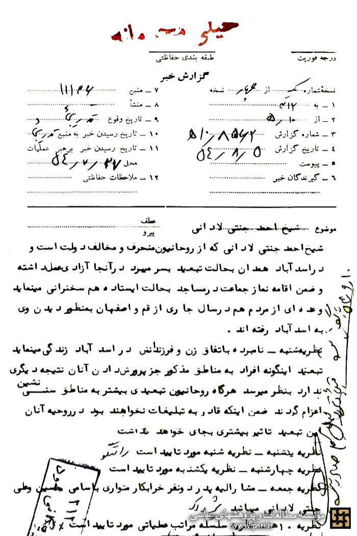 شیخ احمد جنتی لادانی که از روحانیون منحرف و مخالف دولت است و در اسدآباد همدان به حالت تبعید به سر میبرد در آنجا آزادی عمل داشته و ضمن اقامه نماز جماعت در مساجد به حالت ایستاده هم سخنرانی مینماید و عدهای از مردم هم در سال جاری از قم و اصفهان به منظور دیدن وی به اسدآباد رفتهاند.